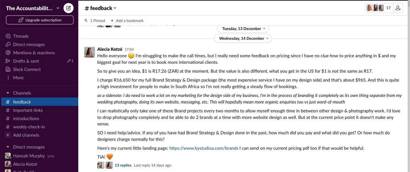 The resources and lessons are not time bound, so you can go through them whenever you like. The only part of the Club that is scheduled is our 3 x monthly office hours calls & Monthly Planning Workshops. I’ve specifically reviewed different timezones and chosen a time that works best for most timezones. However, if for some reason this still doesn’t work for you, you are welcome to ask any questions or request feedback in our Community Slack Channel, where myself and other members will gladly provide support!